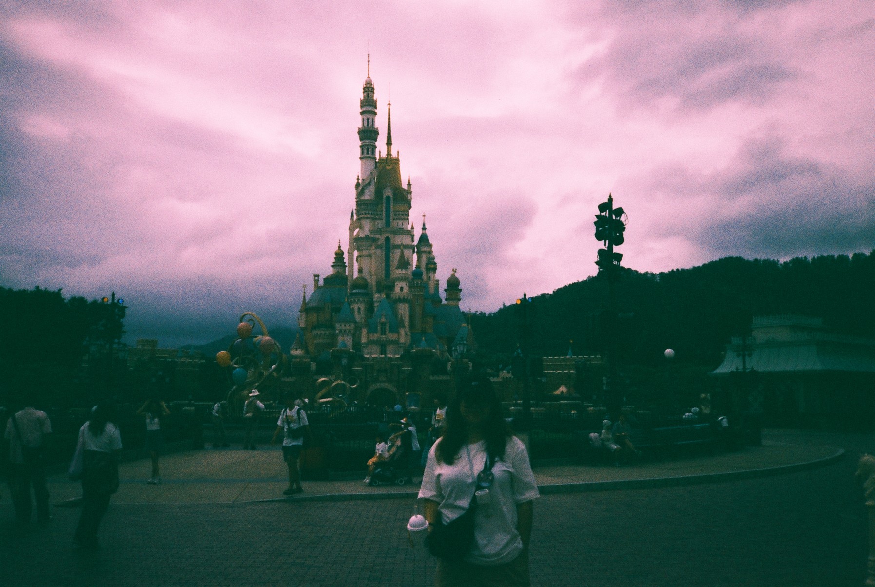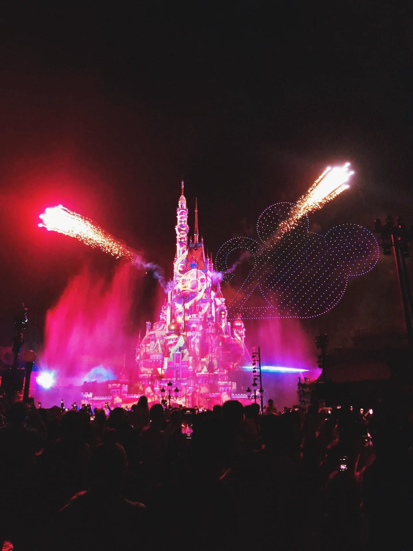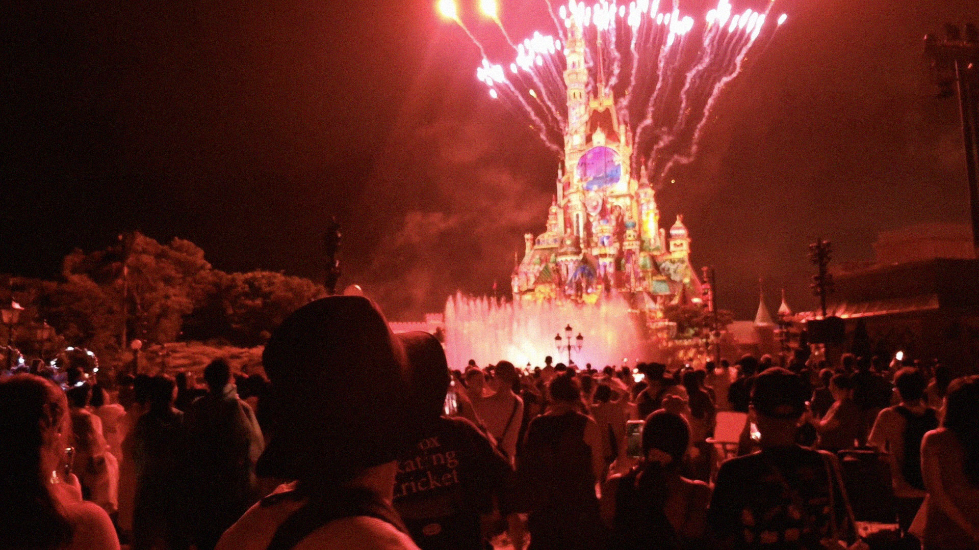 The weather was gloomy and it drizzled occasionally, but overall it was manageable. It was humid but not too hot, and we still had a really good day at the park. Finally, at 8 PM, the fireworks show started. We found a spot that was not too crowded, and I really enjoyed the villain-themed parts. There was a moment when it started raining and the lights hit the raindrops, and it looked magical. I loved it. After the show ended, we hurried to the MTR station and commuted back to our hotel.