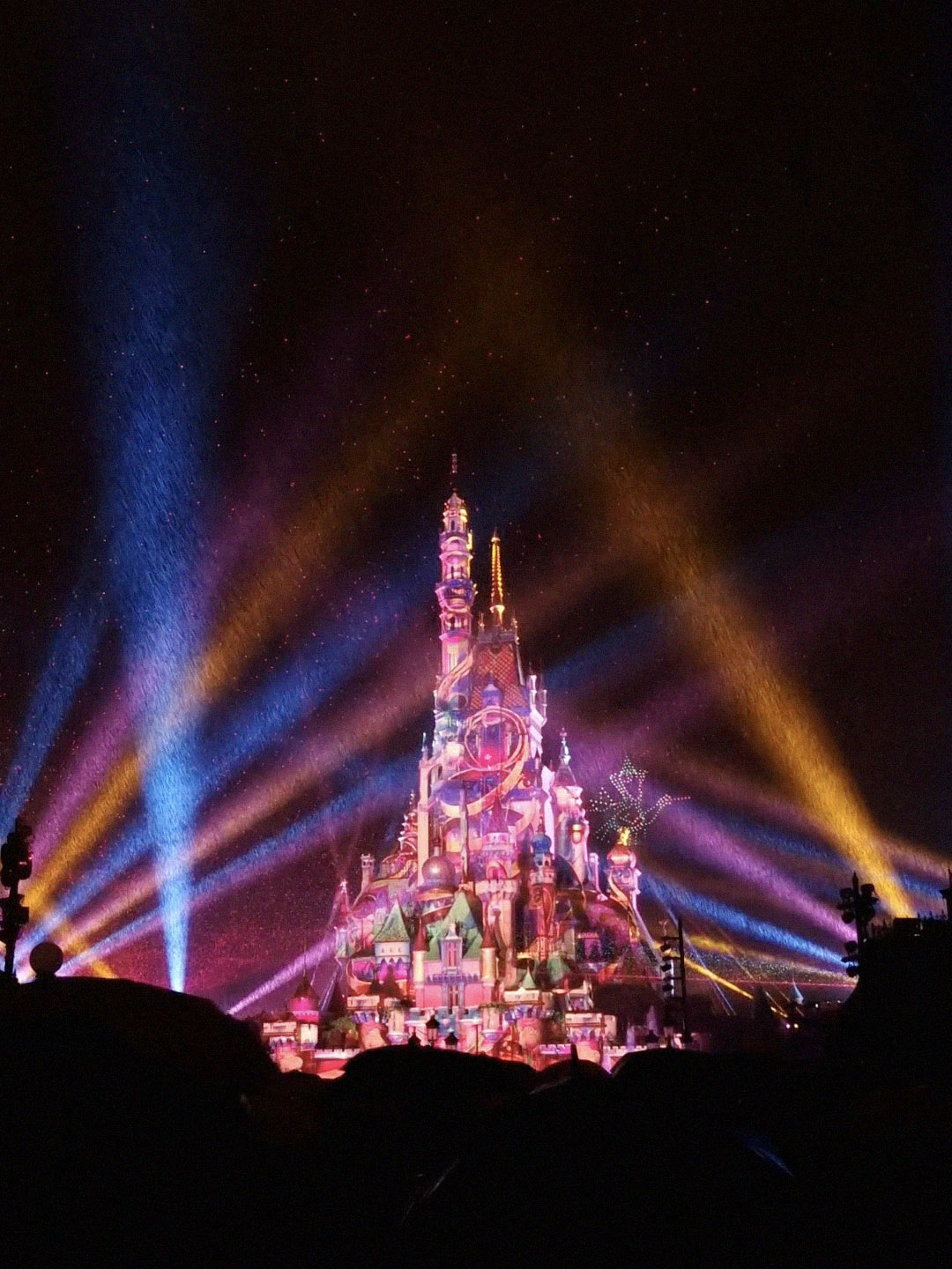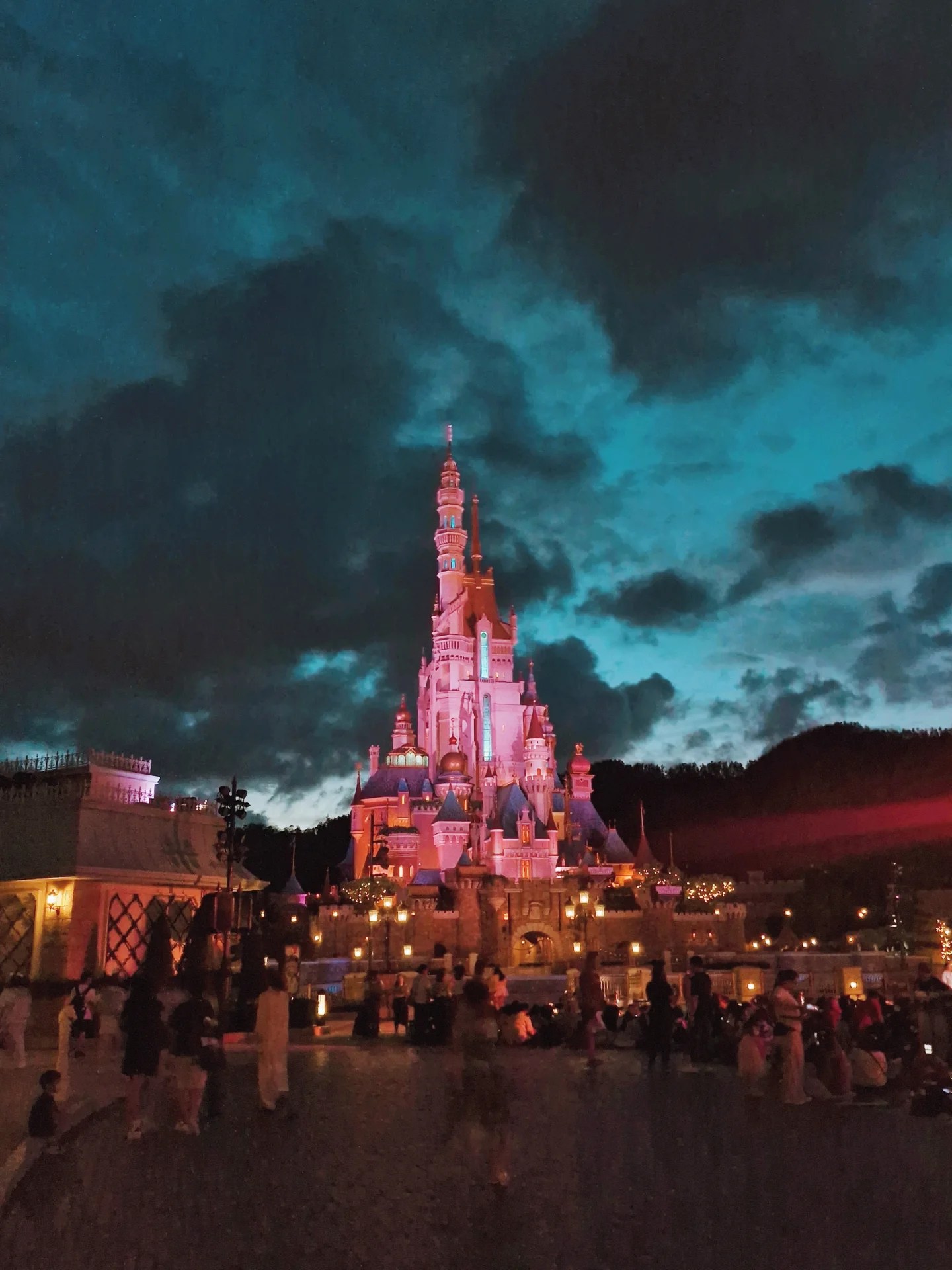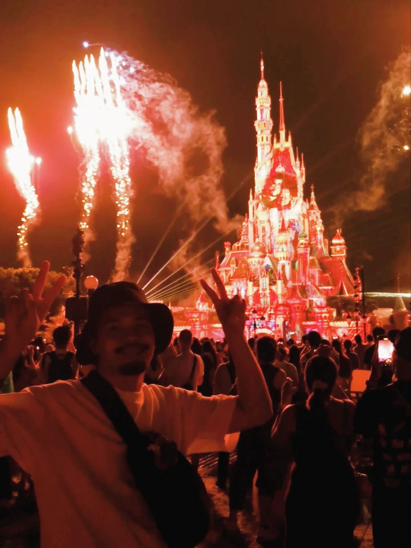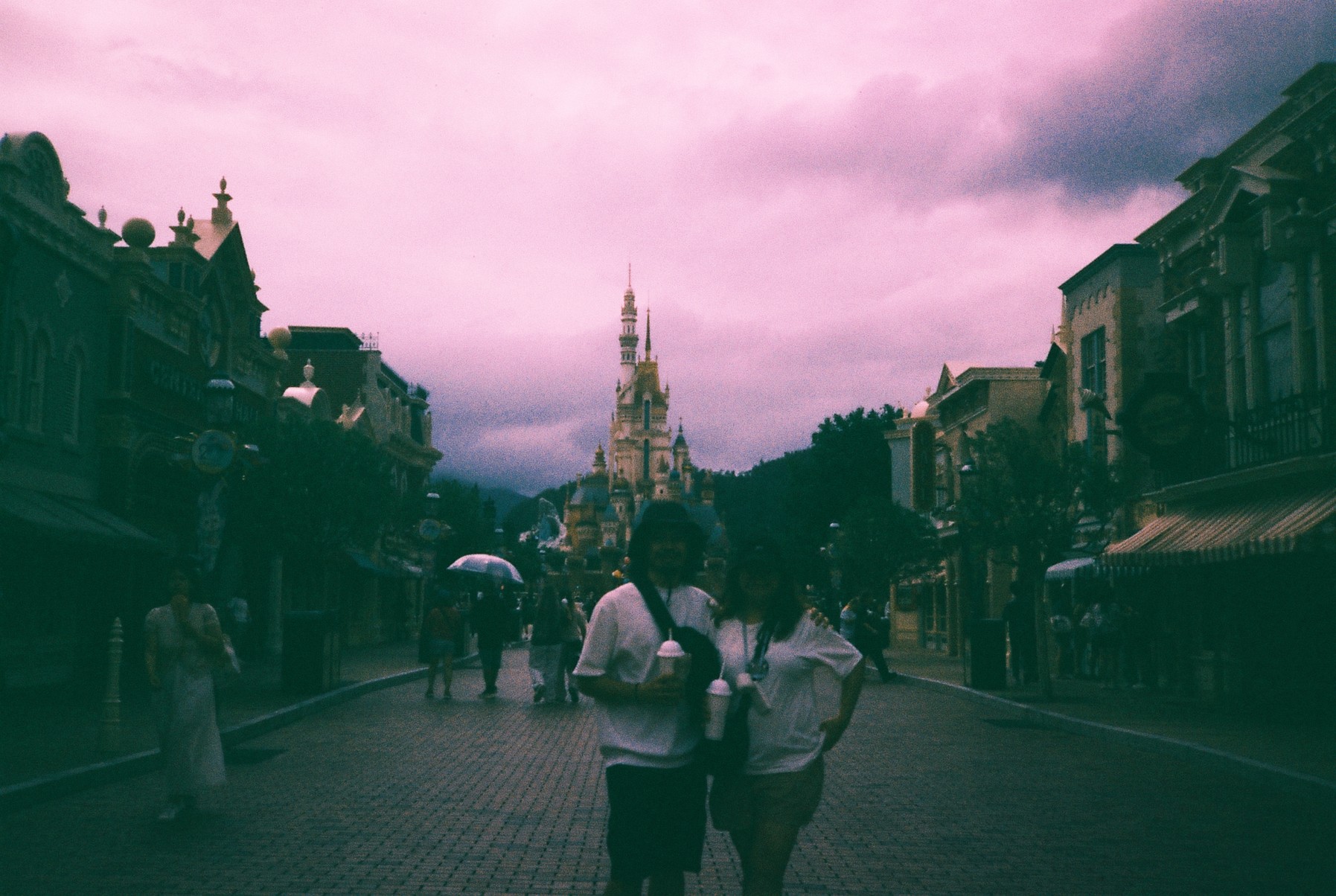 The weather was gloomy and it drizzled occasionally, but overall it was manageable. It was humid but not too hot, and we still had a really good day at the park. Finally, at 8 PM, the fireworks show started. We found a spot that was not too crowded, and I really enjoyed the villain-themed parts. There was a moment when it started raining and the lights hit the raindrops, and it looked magical. I loved it. After the show ended, we hurried to the MTR station and commuted back to our hotel.